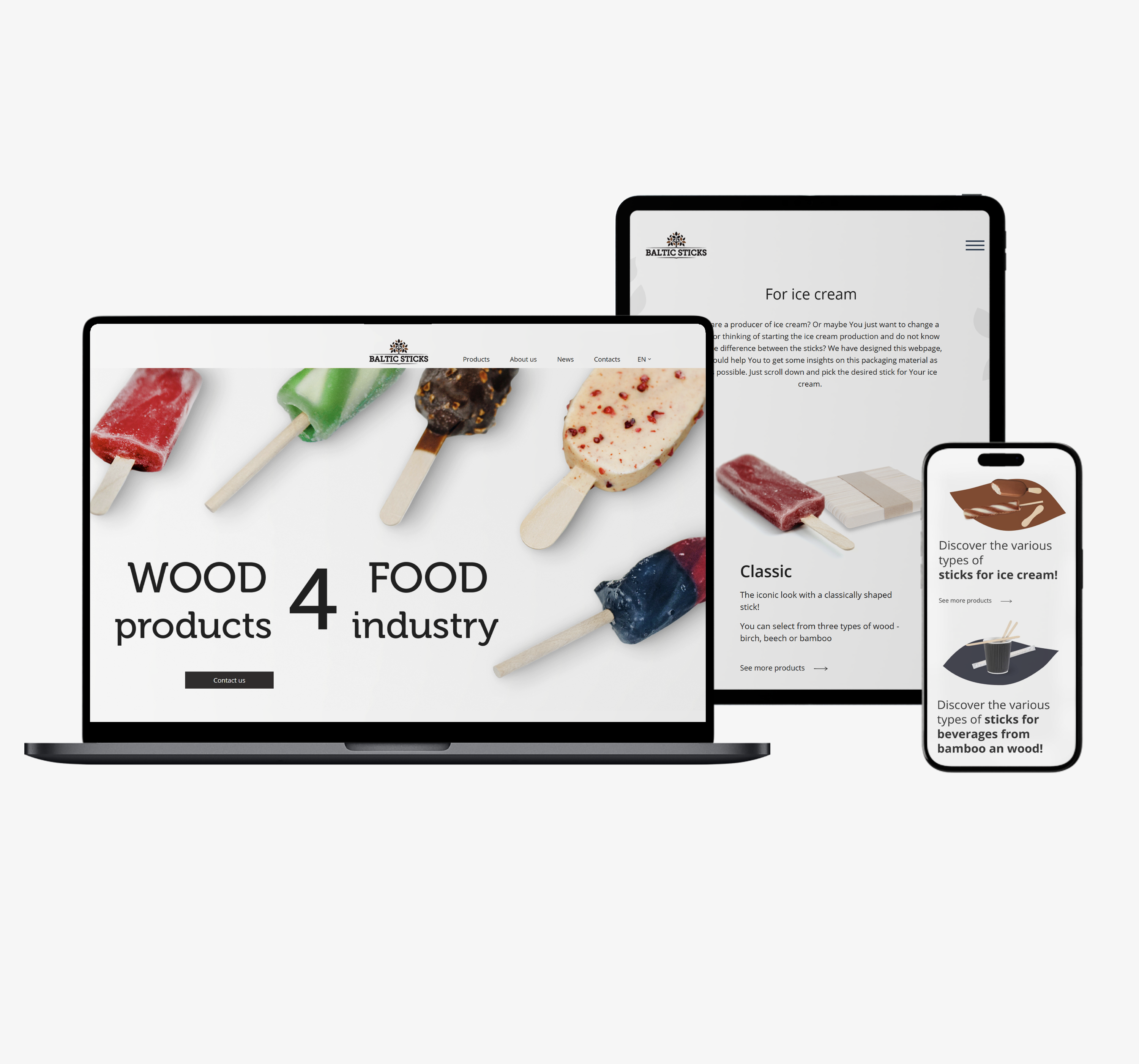 Sukurta interneto svetainė, kuri puikiai reprezentuoja vienintelę ledų pagaliukų gamintoją Baltijos šalyse (pritaikyta ir mobiliai versijai). Pateiktas unikalus svetainės dizaino sprendimas, tad dabar svetainė patraukli ir patikima – juk „Baltic sticks“ klientų yra visame pasaulyje!